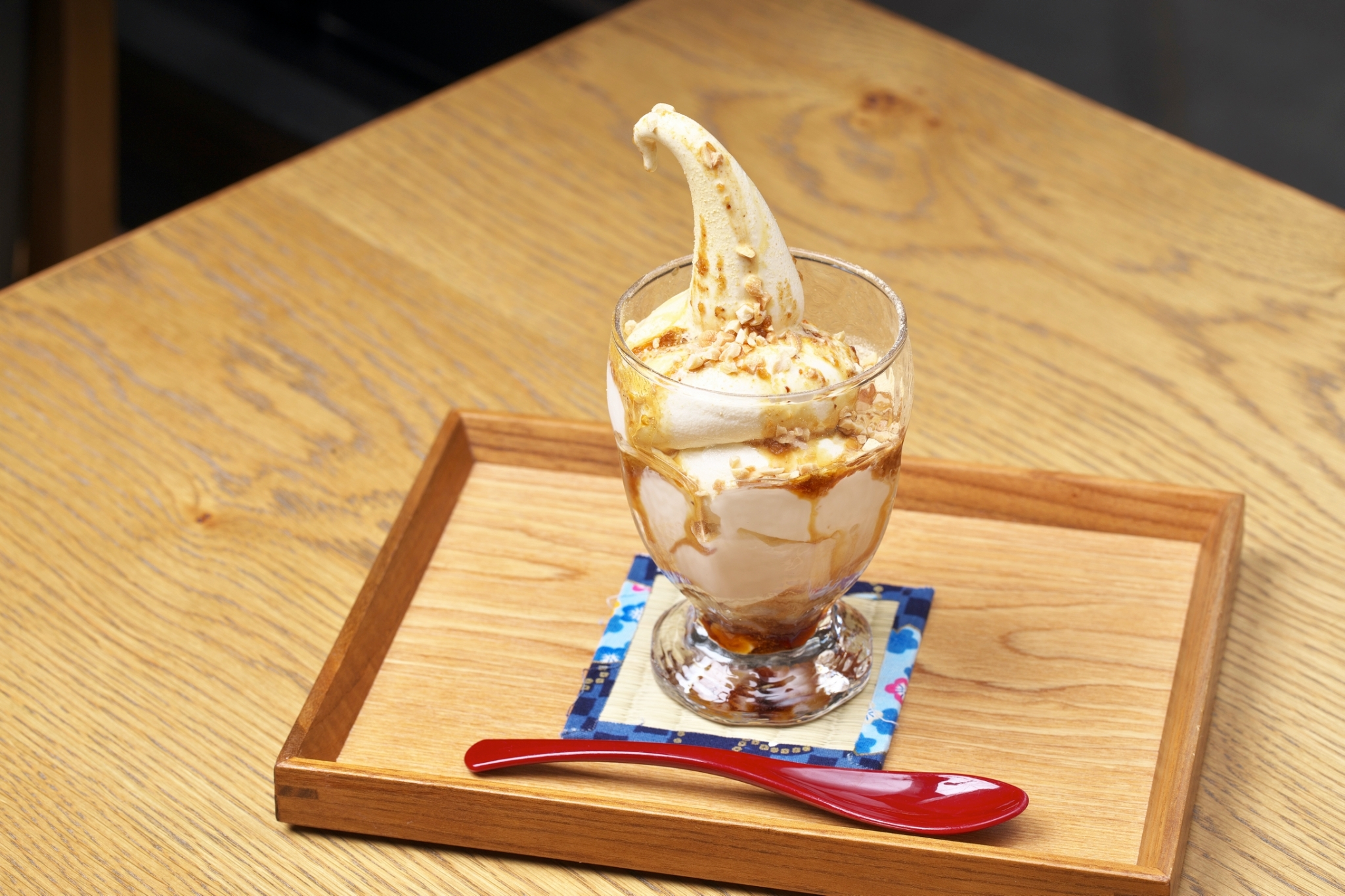 バニラのソフトクリームの上に五平餅のタレときなこがかかっており、中には地元の特産品のこんにゃくが入っています。ここでしか味わえない組み合わせの甘味です。