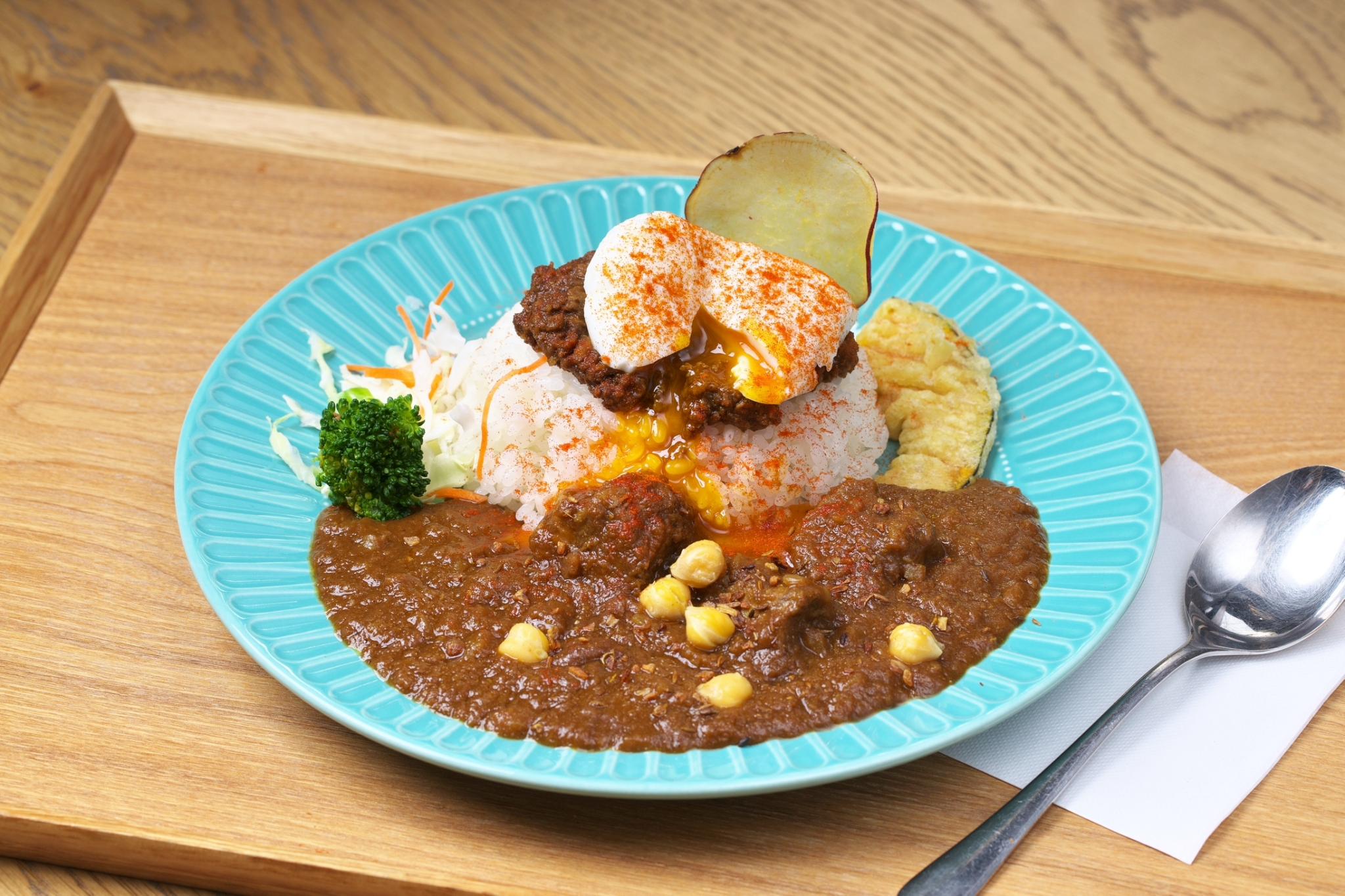 景勝地である達原(たっぱら)渓谷の自然美をイメージして開発した商品です。半熟玉子がとろけて、キーマカレーの上を流れる様子を不動の滝として、ひよこ豆を渓谷の岩肌として表現しています。スパイスの効いた本格的なカレーはボリューム満点で写真映えのする一皿です。