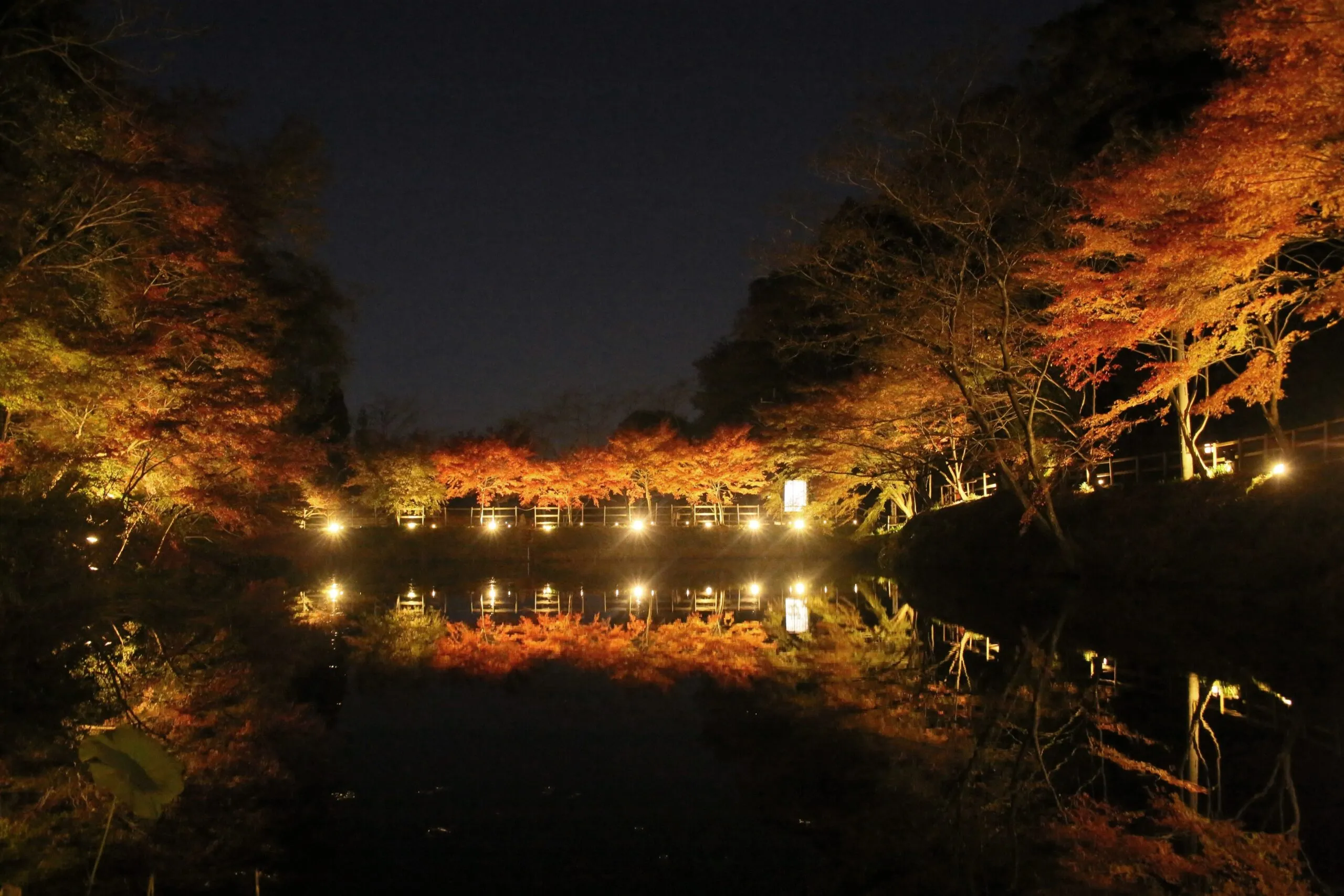 紅葉シーズンの夜間は、地元ボランティアが集まる「土岐里山の会」による「もみじと100地蔵のライトアップ」が開催されています。池の周りを囲む数十本のカエデやモミジの木が、ライトに照らされて水面に映ります。