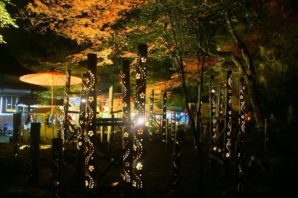 104体の石仏にろうそくが灯され、竹あかりも美しく光り、厳かで神秘的な雰囲気に包まれます。