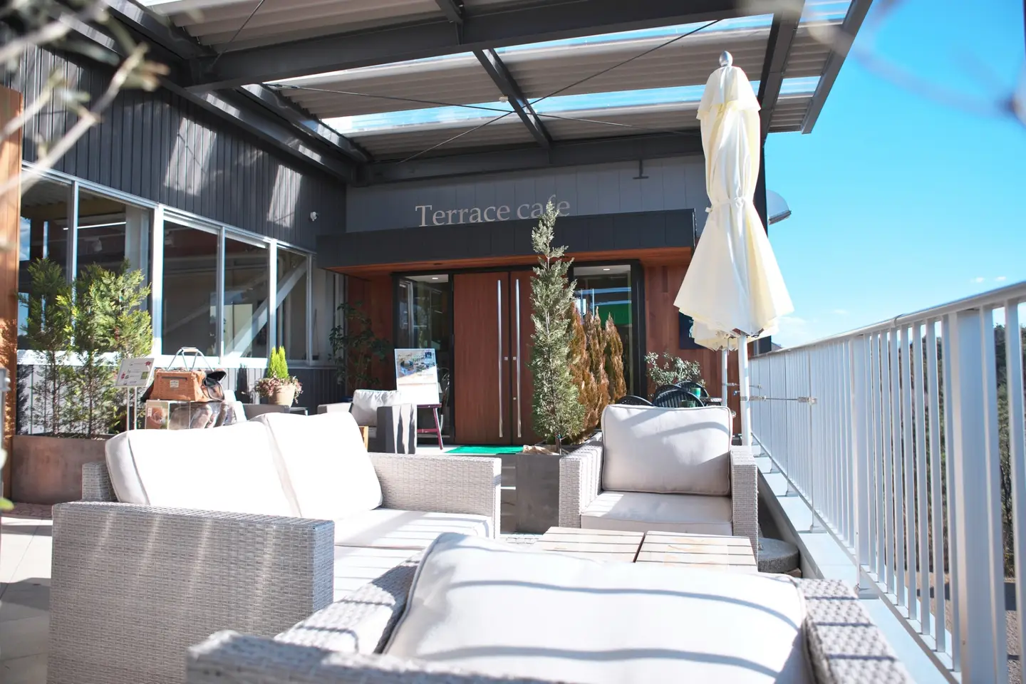 2021年にリニューアルオープンした「Terrace cafe 織部」は、織部本店の一角にあるカフェで、パスタやハンバーグなどのランチセットやデザートが、店内で販売している器で楽しめます。カフェのテラスからは山々の眺めを一望。敷地内には陶芸工房やドックランも併設しており、1日遊べる複合施設です。
