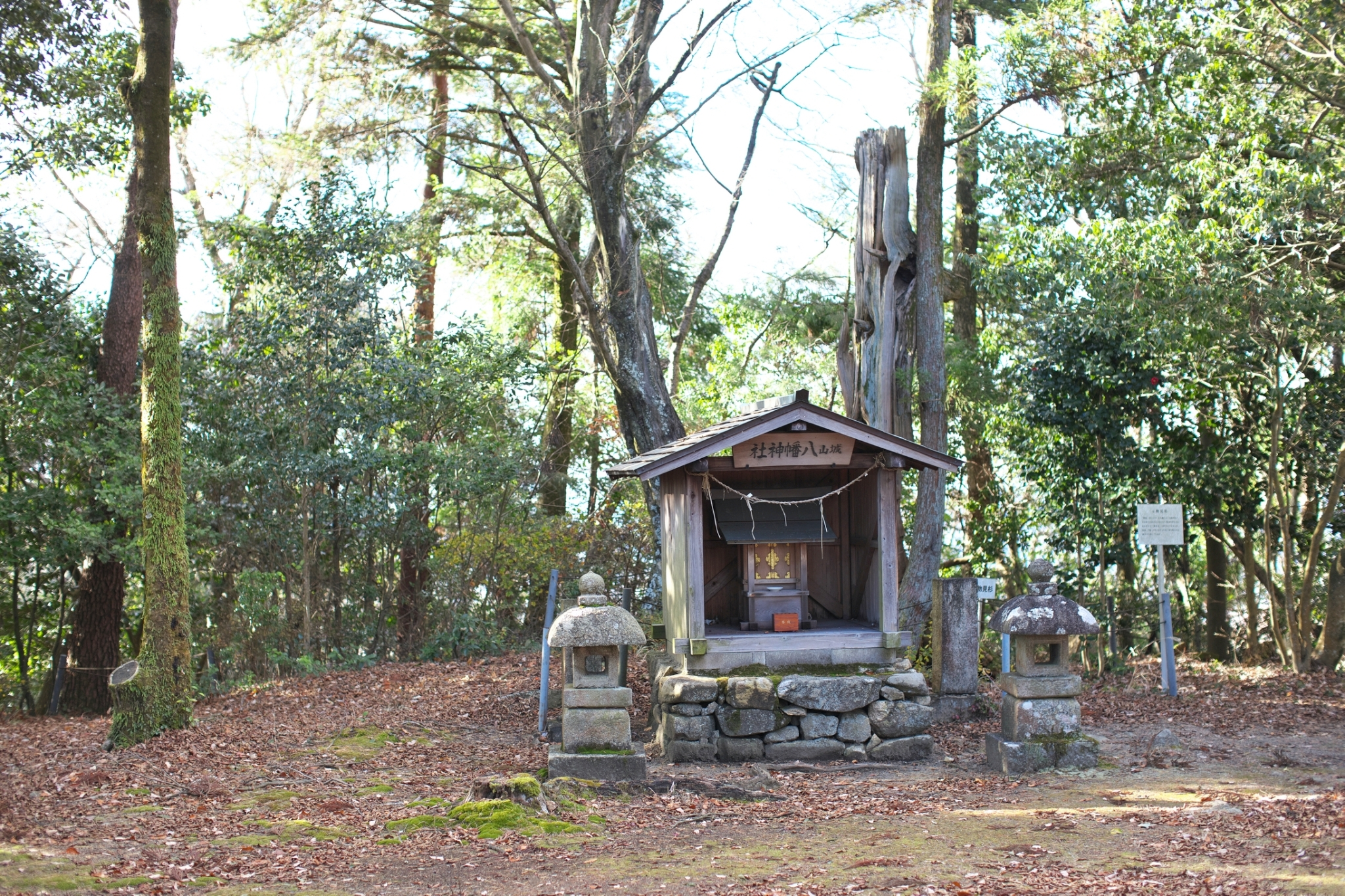 現在も山頂を中心に約200m四方の範囲に、城の区画である曲輪(くるわ)、石垣、土塁などの遺構が残されています。発掘調査の結果、この曲輪には建物の基礎となる礎石がいくつも発見されました。頂上には、「八幡神社」と書かれた祠もあります。