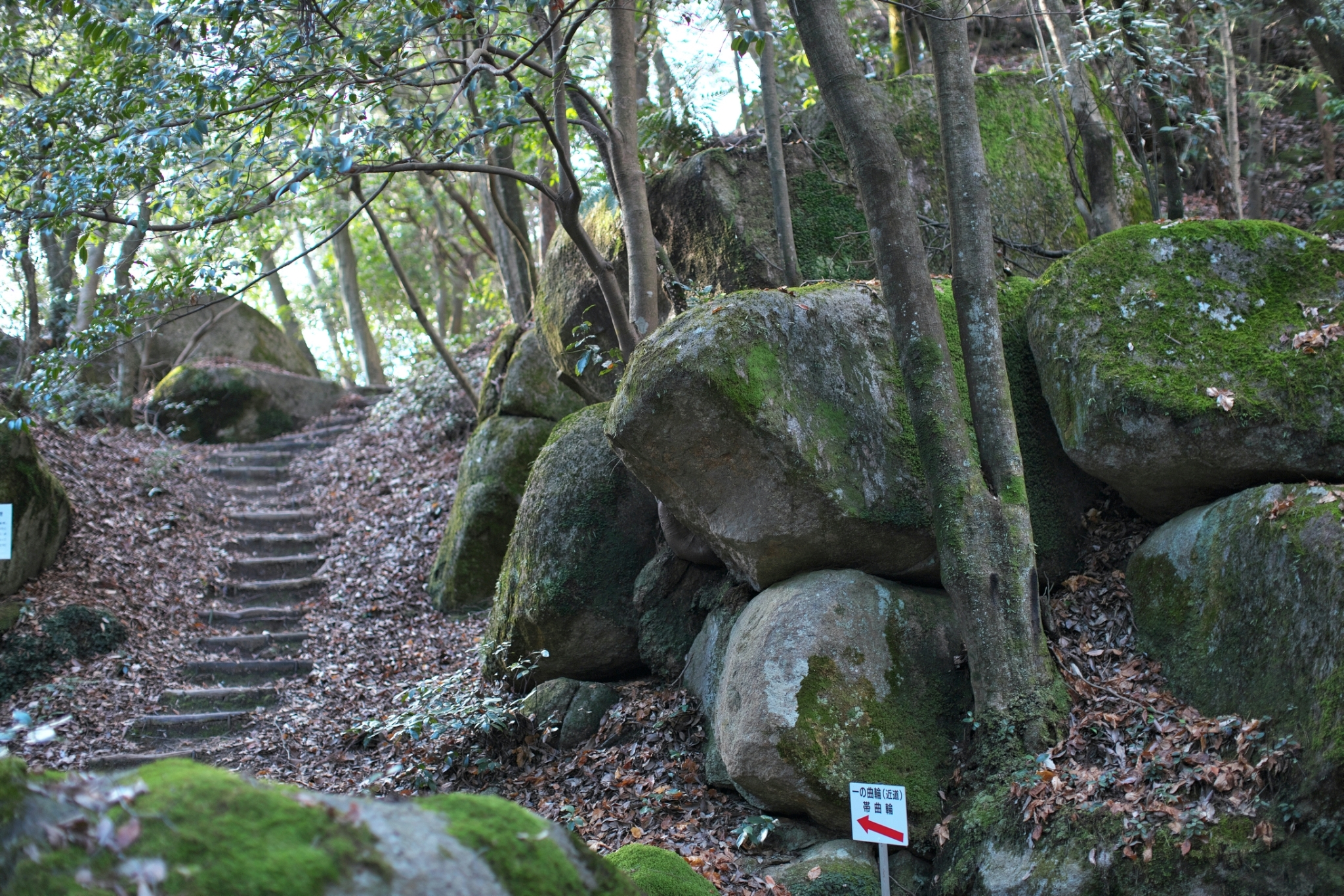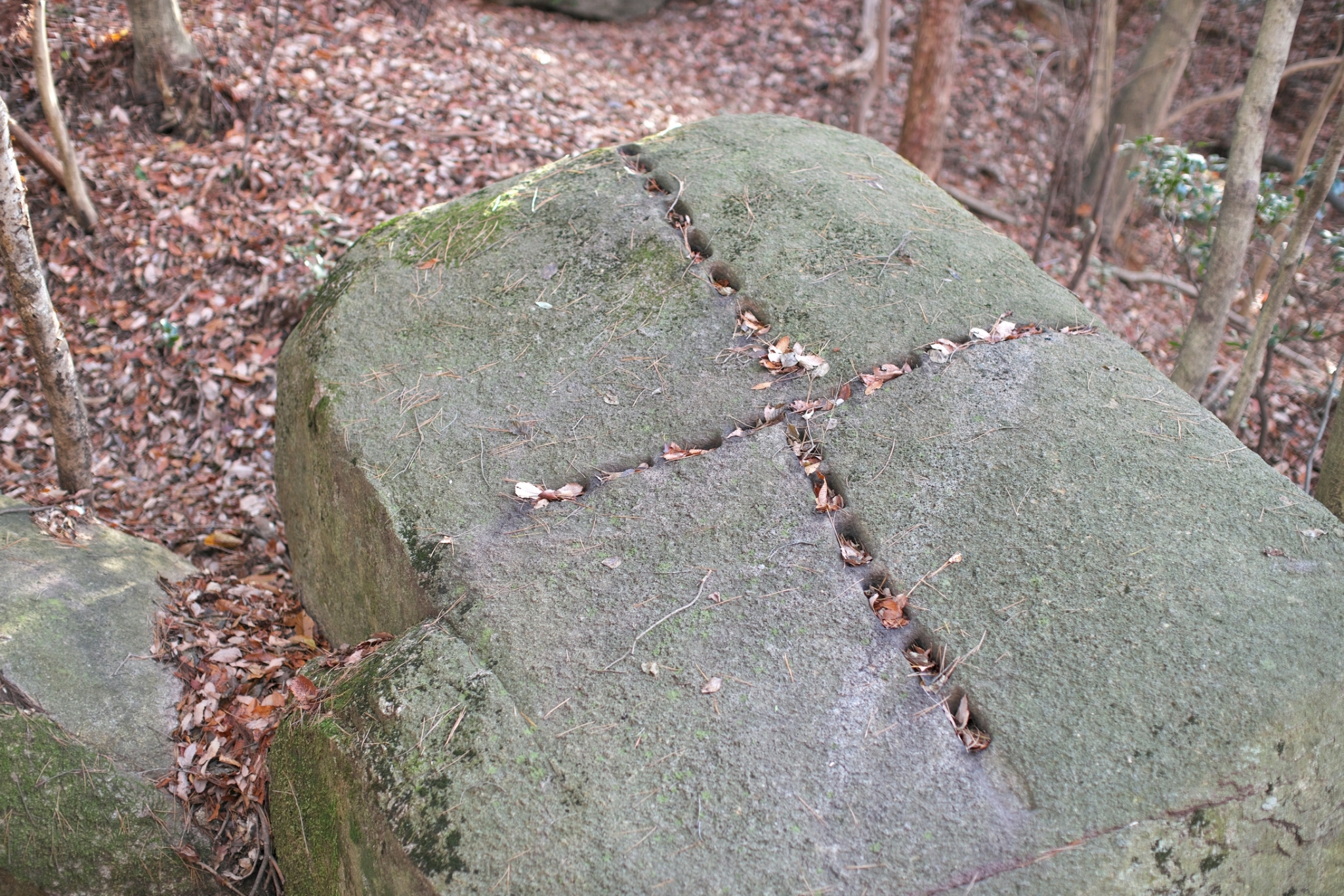 山中には、花崗岩の巨石がたくさんあります。南口駐車場近くの登山口からしばらく登り、太鼓櫓から見下ろすと花崗岩を割るための十字のくさび跡のある巨石が確認できます。
