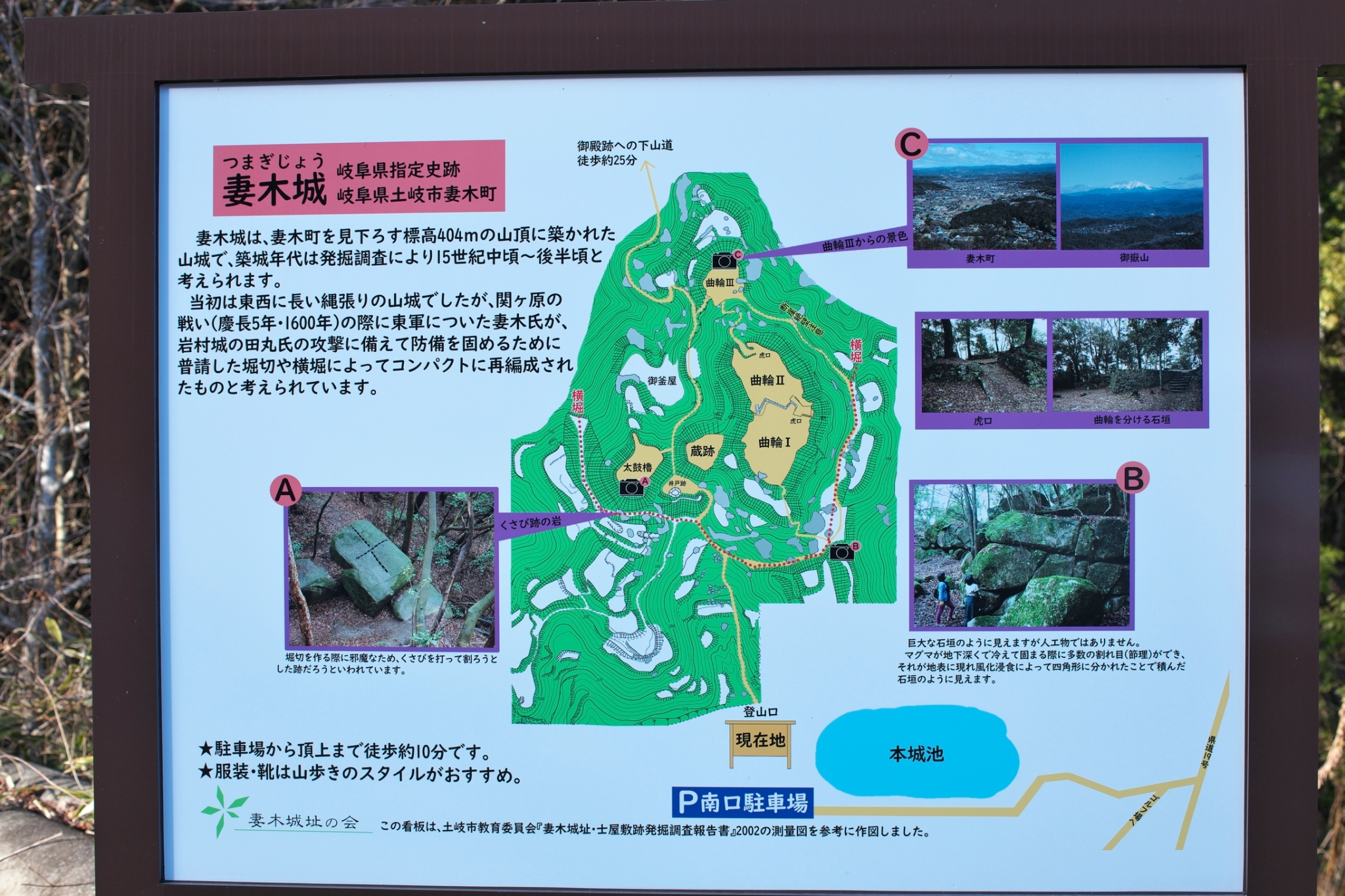 三の丸跡からの眺めは遠くの山々を見渡す絶景で、晴れた日には御嶽山も見られます。南口駐車場からは山頂まで徒歩10分。御殿跡の向かいにある駐車場に停めて登るルートは、山頂まで25分ほどかかります。こちらは険しい道なので山歩きできる格好で登りましょう。山頂の「妻木城跡」、山麓の御殿跡および武家屋敷は「妻木城士屋敷跡」としてそれぞれ県史跡に指定されています。