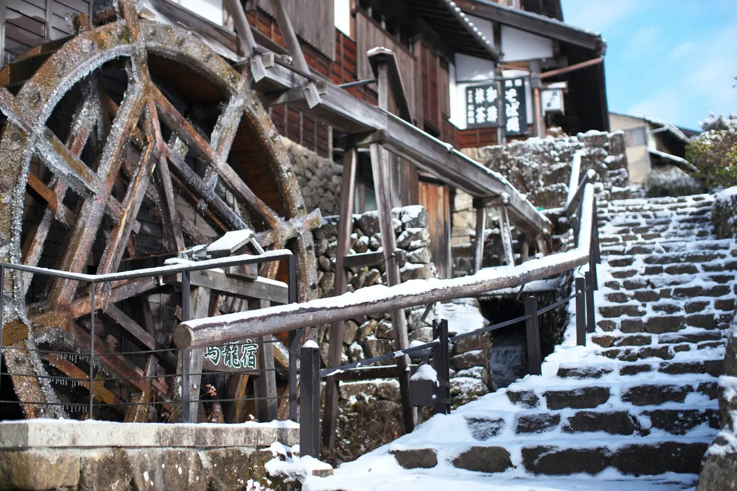 町の中心を流れる水路には水車小屋が佇み、宿場の美しい景観を彩ります。