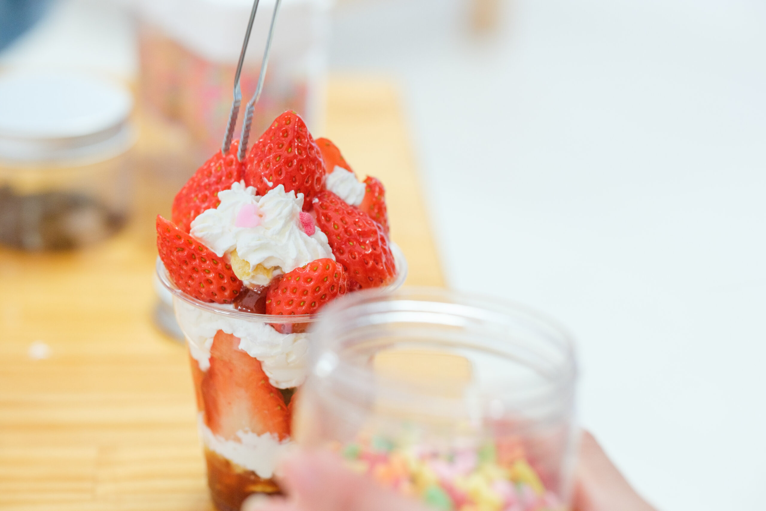 クッキーやシリアル、10種類以上のカラフルなトッピング等の中からお好みのものをチョイス。収穫したいちごと共に思い思いに盛り付けていく作業は、子どものみならず大人もワクワクする体験です。